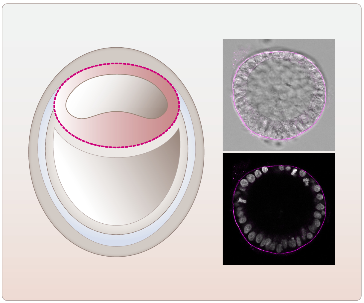 Since many years, we are also working and collaborating on projects making use of in vitro (organotypic reaggregation assays, three-dimensional co-culture models, spheroids, embryoid bodies, organoids) and in vivo approaches to study cell-cell interaction and tissue self-organization (see e.g. Kubista, Oncogene, 2002; Valli, Oncogene 2010; Siegel, Hum Mol Genet 2010; Rosner, Nat Protoc 2010; Unterleuthner, Angiogenesis 2020; Wilson, Cell Reports 2020; Koncina, Nat Comm 2023; Celada, Sci Transl Med 2023; Fritsch, Cell Metab 2023). In this context, we are currently using a pluripotent-stem-cell-based model of the human post-implantation embryo. Up to 50% of human embryos do not develop to the implantation stage or the pregnancies fail, mostly in the first weeks post fertilization. In addition, many human disorders already start to develop during early embryogenesis. However, due to experimental, ethical, and legal limitations and because of the differences between animal and human embryogenesis the regulation of the human peri-implantation period has remained elusive so far. In our lab we mimic this natural human embryonic development including the onset of gastrulation by making use of the stem-cell-based three-dimensional post-implantation amniotic sac embryoid (PASE). Using this embryo model we were able to draw a picture of the assembly of the embryonic basement membrane, to study its disintegration during primitive streak development, and to show that the transcription factor Oct4 is a potent regulator of basement membrane development during human embryogenesis (Fig. 3).